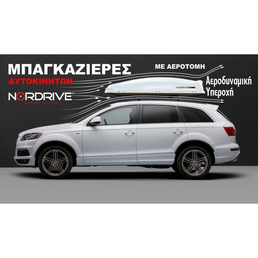 Μπαγκαζιέρα οροφής αυτοκινήτου από την εταιρία NORDRIVE, ιταλικής προέλευσης, κατασκευασμένη από ανθεκτικό τριπολυμερές ABS πλαστικό πάχους 4 mm για προστασία από υπεριώδη (UV) ακτινοβολία σε συνδυασμό με πλαστικό PMMA, ένα θερμοπλαστικό ακρυλικό πολυμερές από πολυμεθακρυλικό μεθύλιο, το οποίο φημίζεται για την αντοχή του σε γρατζουνιές και εκδορές.