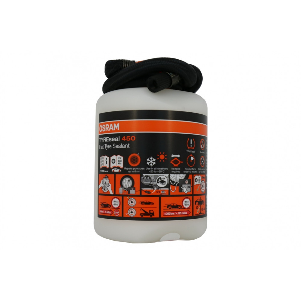 Το OSRAM TYREseal 450 είναι ένα στεγανωτικό ελαστικών που μπορεί να χρησιμοποιηθεί ως αντικατάσταση του αρχικού σετ στεγανοποίησης ελαστικών του κατασκευαστή*. Το OSRAM TYREseal 450 σας επιτρέπει να σφραγίζετε τρύπες έως 6 mm χρησιμοποιώντας την τελευταία τεχνολογία gel σωματιδίων και στη συνέχεια να φουσκώνετε ξανά το ελαστικό σας με έναν συμπιεστή ελαστικών.