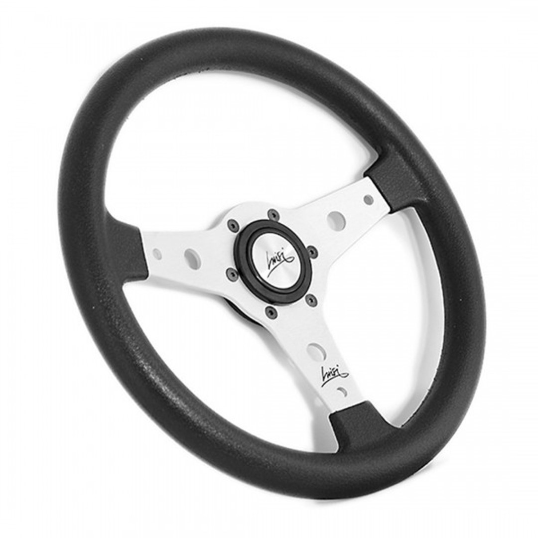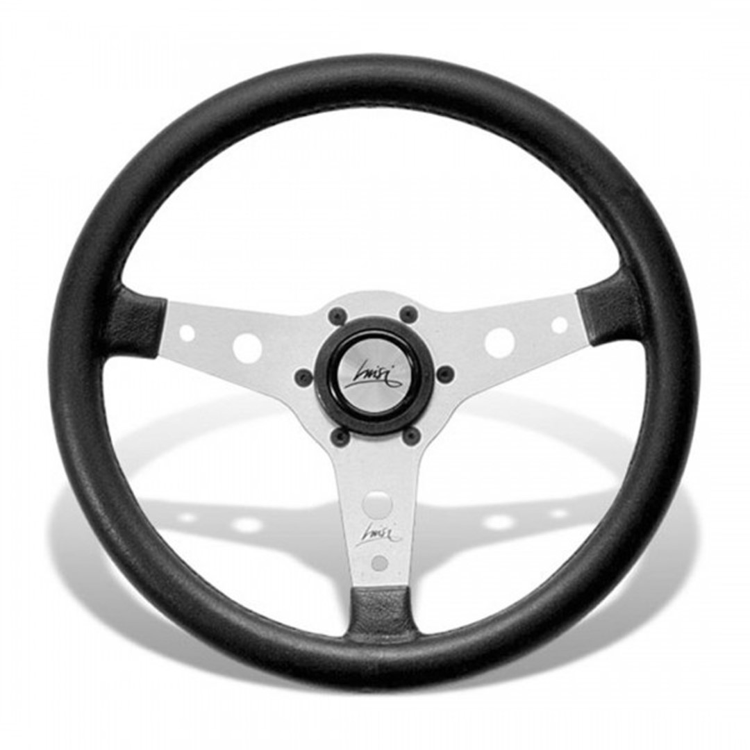 Τιμόνι αυτοκινήτου της POLYURETHANE/TANEGUM σειράς από την εταιρία LUISI, ιταλικής προελεύσεως σε μαύρο χρώμα και χρωμιομένο διακοσμητικό καπάκι με logo στο κέντρο του, κατασκευασμένο από καουτσούκ (tanegum) και μεταλλική ασημί λάμα. Διαθέτει λαβή με ελαφρώς σαγρέ υφή και 3 μεταλλικές ακτίνες (μπράτσα) σε ίσια γραμμή. Έχει universal εφαρμογή, για να ταιριάζει στα περισσότερα μοντέλα αυτοκινήτων και προσφέρει ασφαλές, άνετο κράτημα, προσδίδοντας παράλληλα μία μοναδική κομψότητα στο εσωτερικό του οχήματος. Εύκολη και γρήγορη τοποθέτηση.